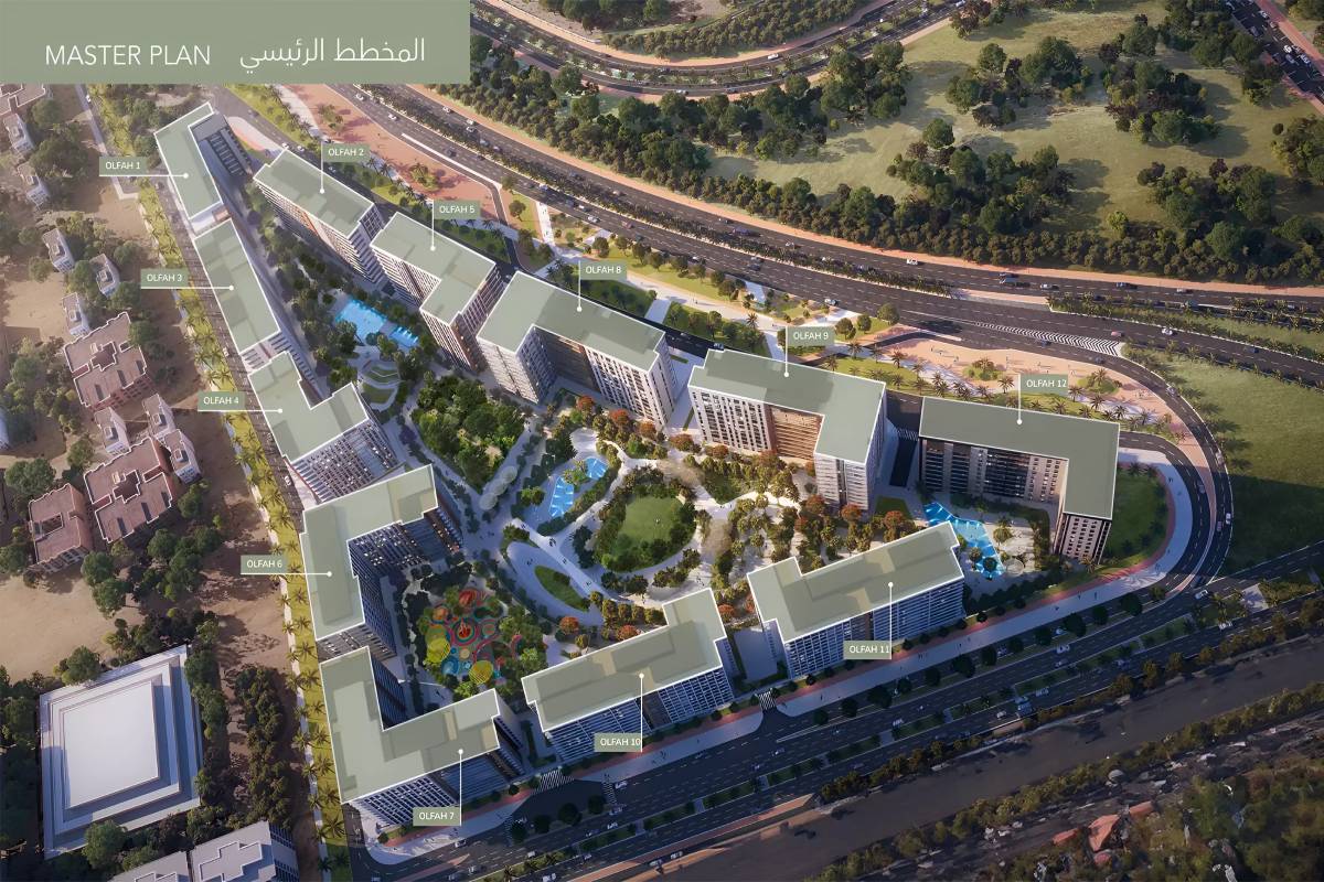 Olfah Phase 2 is a visionary residential project developed by Alef Group, positioned in the high-growth Muwaileh Commercial district of Sharjah. Part of a massive AED 2.5 billion masterplan, Phase 2 continues the “forest-inspired” living concept, where nature and modern architecture coexist. The project is characterized by its 12 residential towers (ranging from 9 to 11 floors) built on a unified platform, creating Sharjah’s first fully car-free and walkable neighborhood. With over 26,000 square meters of greenery, residents enjoy a private ecosystem of woodland walks and parks.